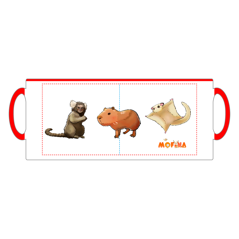 モフィーナにいる動物さんが描かれたマグカップです。 フクロモモンガのテトさん カピバラのモッフィーさん コモンマーモセットのちょもすけさん が描かれています。